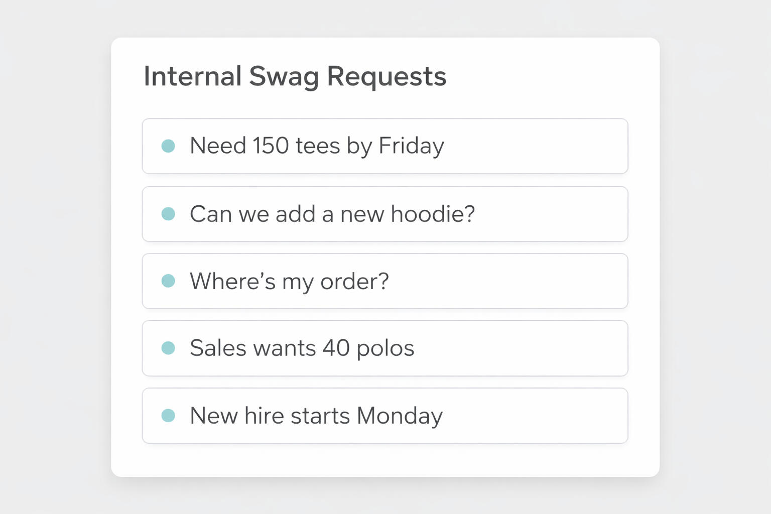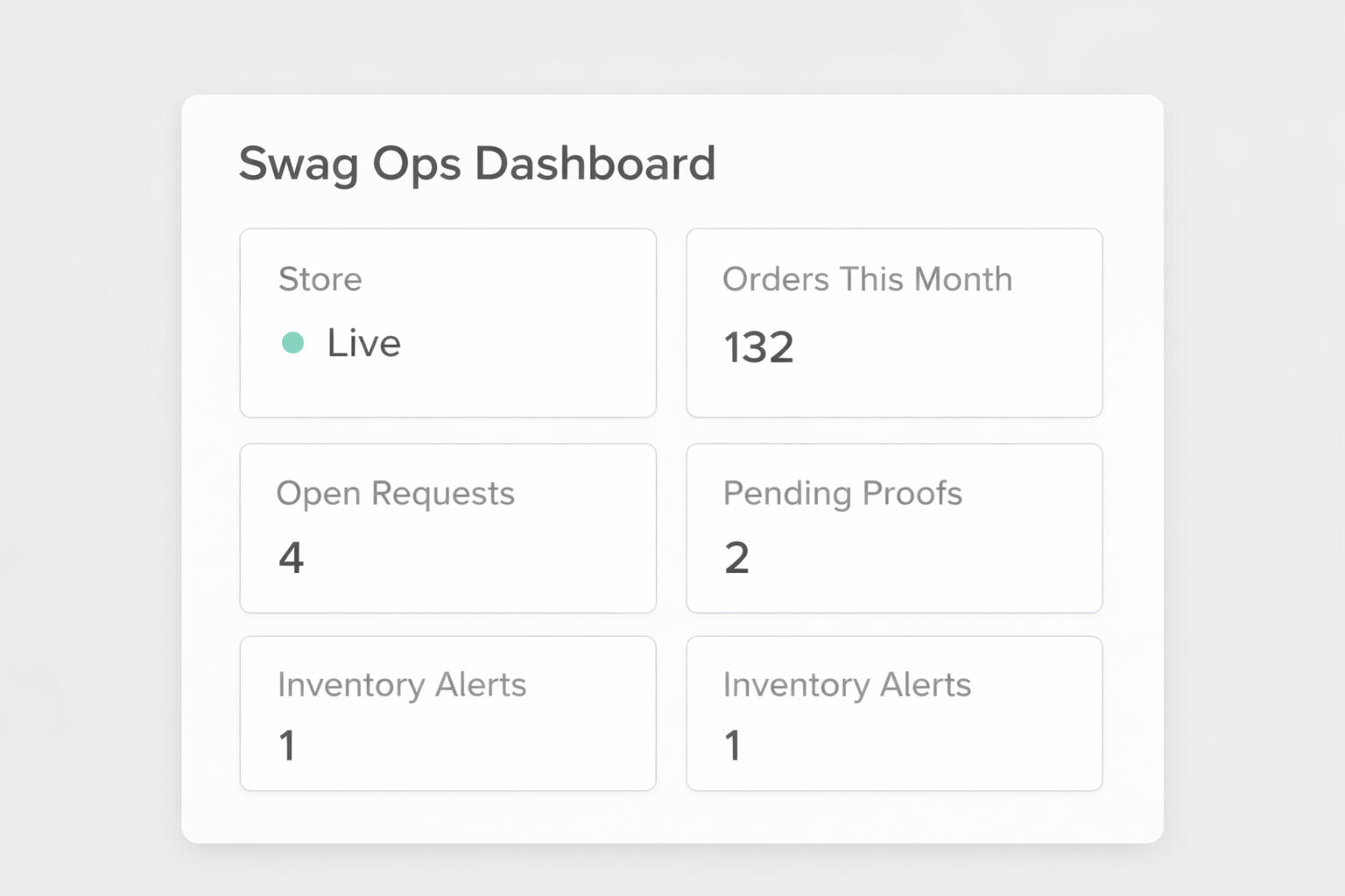 We act as your dedicated swag operations layer.We manage vendors, handle internal requests, keep your store clean and current, and make sure orders move without you chasing updates.One system. One point of contact. No chaos.